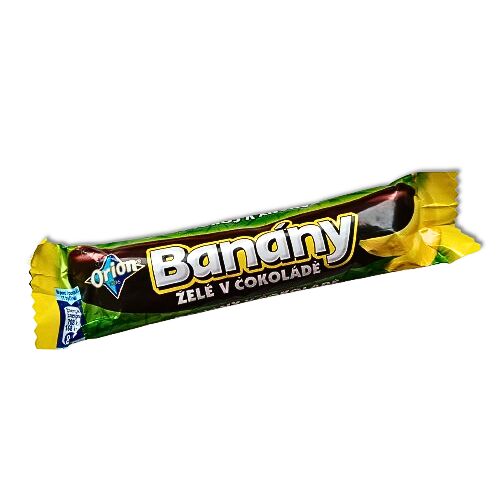 Želé s chutí banánů 74 % máčené v hořké čokoládě 26 %.www.orioncokolada.cz.Želé s chutí banánů máčené v hořké čokoládě.Vychutnejte si lahodné Banány v čokoládě, které jsou na trhu již 90 let. Jejich dominantní postavení v segmentu tyčinek typu želé v čokoládě jim po celou dobu zabezpečuje jejich unikátní a oblíbená chuť, která vznikla spojením banánového želé a lahodné hořké čokolády. Tyčinka obsahuje pouze přírodní aromata a neobsahuje lepek.